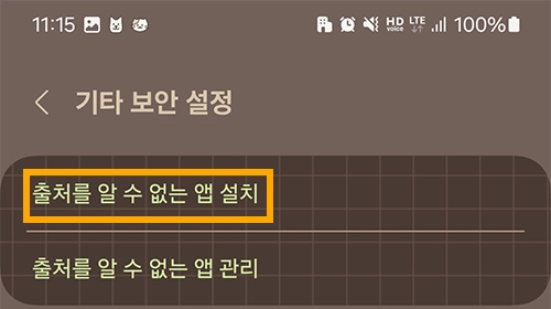 기타 보안 설정 중 [출처를 알 수 없는 앱 설치] 부분에 들어가면