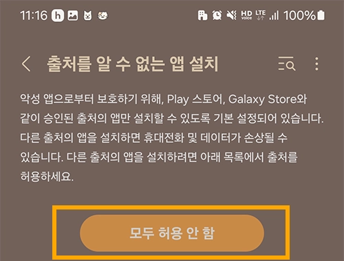 위와 같은 기능을 사용하면, 휴대폰에서 문자를 눌렀을 때 앱이 설치되려고 하면 안내 문구가 한 번 더 뜬다.