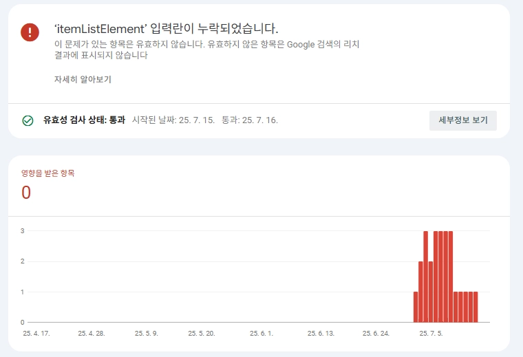 }그런데 구조화 데이터에서 itemListElement가 빠져 있거나 비어 있으면 오류로 잡는다.