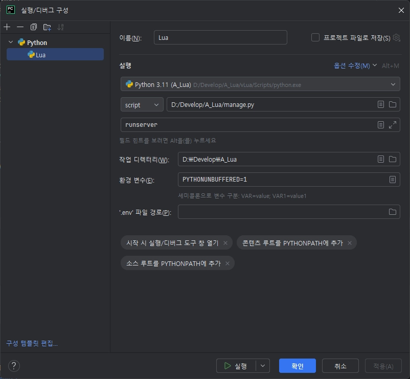 # 가상환경 D:\Python\python311\python.exe -m venv vLua # 장고 pip install django # MySQL DB pip install pymysql # 장고 CORS pip install django-cors-headers # iis 세팅용 pip install wfastcgi # 엑셀 다운로드 pip install openpyxl # 이미지 필드 사용을 위해서 pip install Pillow # 캐시, 세션, 검색결과 저장 pip install redis # 자동완성, 유사문장 검색 엔진 pip install meilisearch # AI 모델 학습 및 분류 pip install scikit-learn pandas numpy # 기본 프로젝트 django-admin startproject back . # 앱 python manage.py startapp web
